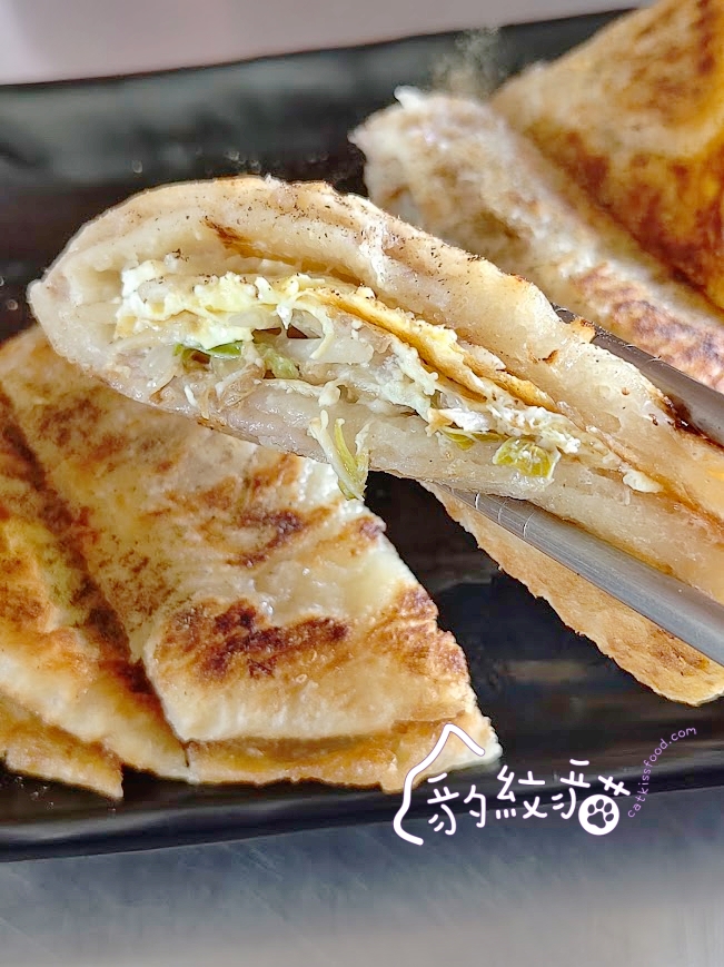 餡餅皮被煎的「赤赤赤」(台語),一份分切成4-5塊,然後略撒上胡椒粉。